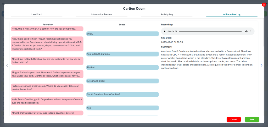 Through our partnership with TruckersFlow.app, their ATS/CRM features a clean, user-friendly interface that allows you and your recruiters to quickly view call summaries, read full transcripts, or listen to the entire conversation with ease.